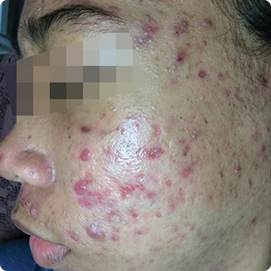 Jerawat aktif yang menyebar dan menimbulkan benjolan kemerahan, bengkak, dan nyeri.